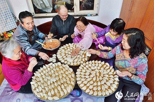 图为呼和浩特市清泉街社区的少数民族居民围坐在一起包饺子:“生活在这个社区的各族群众之间和谐团结,大家将心比心以心换心,亲如一家心连心。”(资料图)