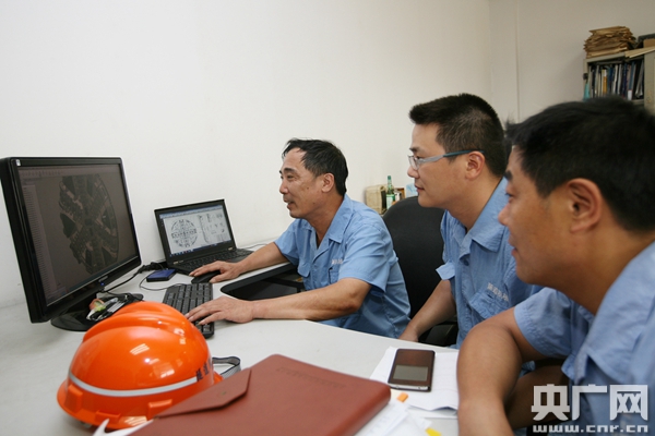 李建伟与工友讨论盾构的构架问题