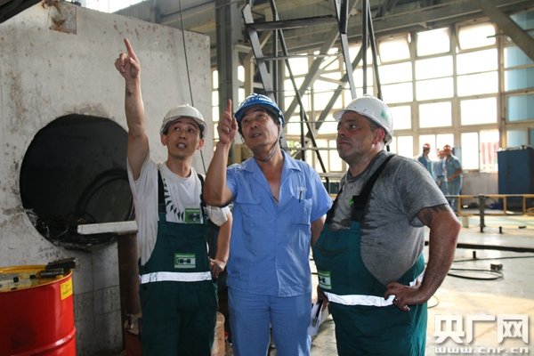 李建伟在车间与德国人商量工程事宜 央广网记者王晶摄