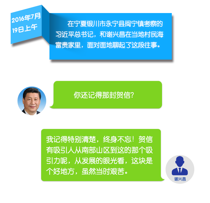 2016年7月19日上午,在宁夏银川市永宁县闽宁镇考察的习近平总书记,和谢兴昌在当地村民海富贵家里,面对面地聊起了这段往事。
