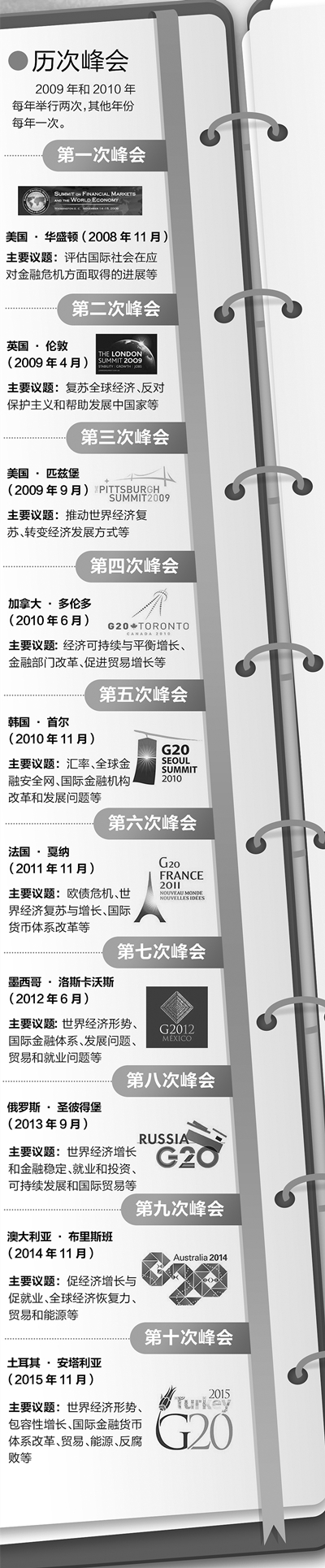 迄今,G20已举行了10次峰会,形成了以峰会为引领、协调人和财金渠道“双轨机制”为支撑、部长级会议和工作组为辅助的架构。