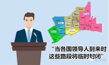 多伦多市在峰会举办日的前一个月左右,通过媒体向社会公布了峰会举办期间的交通管理计划。该计划向市民提前预警并告知:在峰会举办前后,市区主要路段的管制区域、时间;各国领导人到来时,需要临时关闭的主要路段地点和关闭时间,并提供了绕行路线地图。