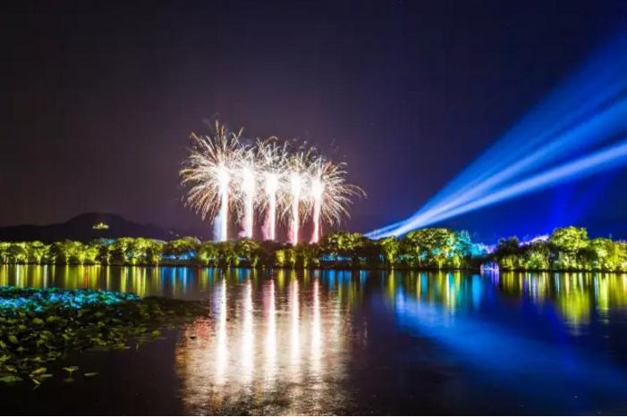 △杭州,西湖烟花,西湖全封闭前最后一次G20彩排。