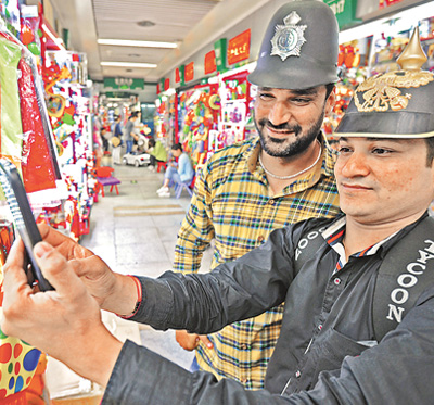 印度客商在义乌中国小商品城试戴仿古头盔。新华社记者 谭 进摄