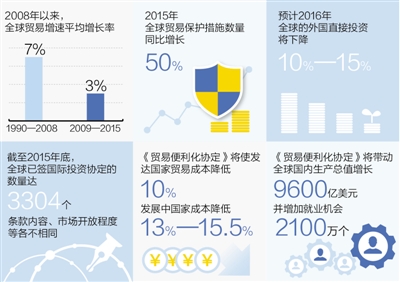 低迷数字背后,是形形色色的贸易保护主义。世界贸易组织的数据显示,自2008年以来,二十国集团(G20)成员共采取1583项贸易限制措施。更糟糕的是全球贸易治理呈现碎片化趋势。一方面,双边自由贸易协定如雨后春笋大量“生长”;另一方面,多边贸易体制却陷入困境,世贸组织多哈回合谈判步履维艰,各种区域性自贸协定不断涌起……