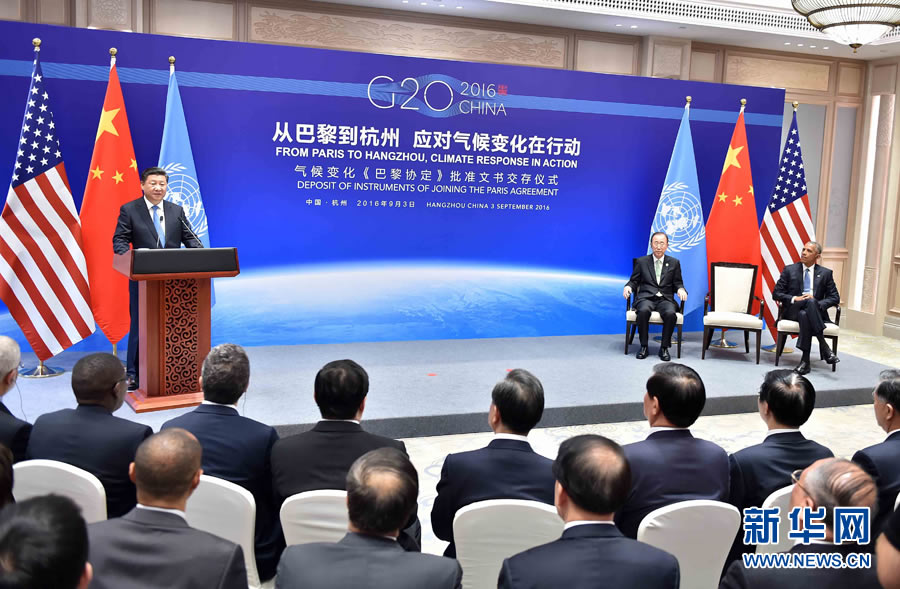 当天下午,习近平同奥巴马、潘基文在杭州共同出席了气候变化《巴黎协定》批准文书交存仪式。