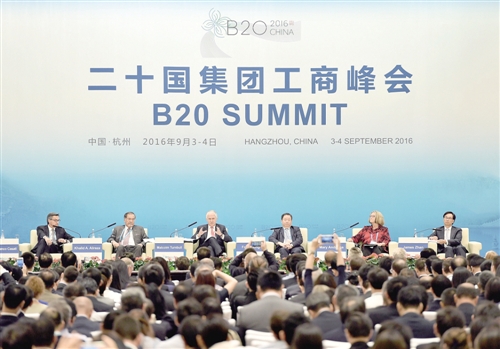 9月4日,澳大利亚总理特恩布尔(左三)在研讨会上发言。当日,二十国集团工商峰会在浙江杭州举办“实现强劲的国际贸易和投资”专题研讨。 新华社记者 李 鑫摄