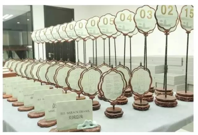 △元首、配偶及嘉宾席上都放置了一个丝绸收纳包