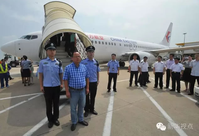 2016年7月13日,在武汉天河机场,“百名红通人员”朱海平从美国回国投案自首。标志着“百名红通人员”已有三分之一落网。新华社发