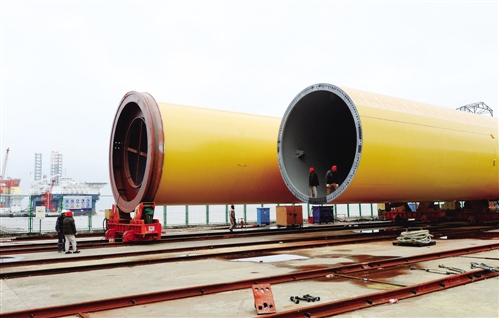 12月14日,南通蓝鸟海洋工程有限公司员工正在组装风力发电钢管桩。近年来,江苏启东积极推进供给侧结构性改革,逐步淘汰低端船舶制造等落后产能,努力实现从传统造船业向高端装备制造、电子及新能源产业的转型升级。李存根摄(新华社发)