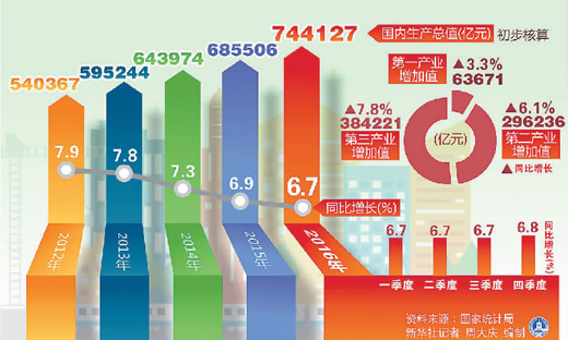 本报北京1月20日电 (记者陆娅楠)国家统计局1月20日公布,初步核算,2016年我国国内生产总值首次迈上“70万亿”台阶,为744127亿元,按可比价格计算,比上年增长6.7%。