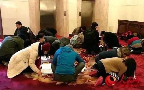 采访完嘉宾,记者们趴在大厅里发稿,抢速度、拼深度、比角度。