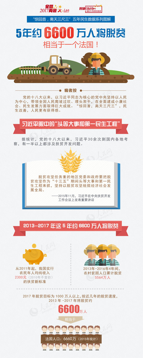 2013-2017年,这5年我国约6600万人将要脱贫。贫困发生率从10.2%下降到4.5%。“原来靠吃野菜填肚子,现在顿顿都有油水!”“去年,家里各种收入有7万多块钱,人均差不多8000多块。”“今年手头宽松了!”“看来今年过了个‘肥年’啊!”……