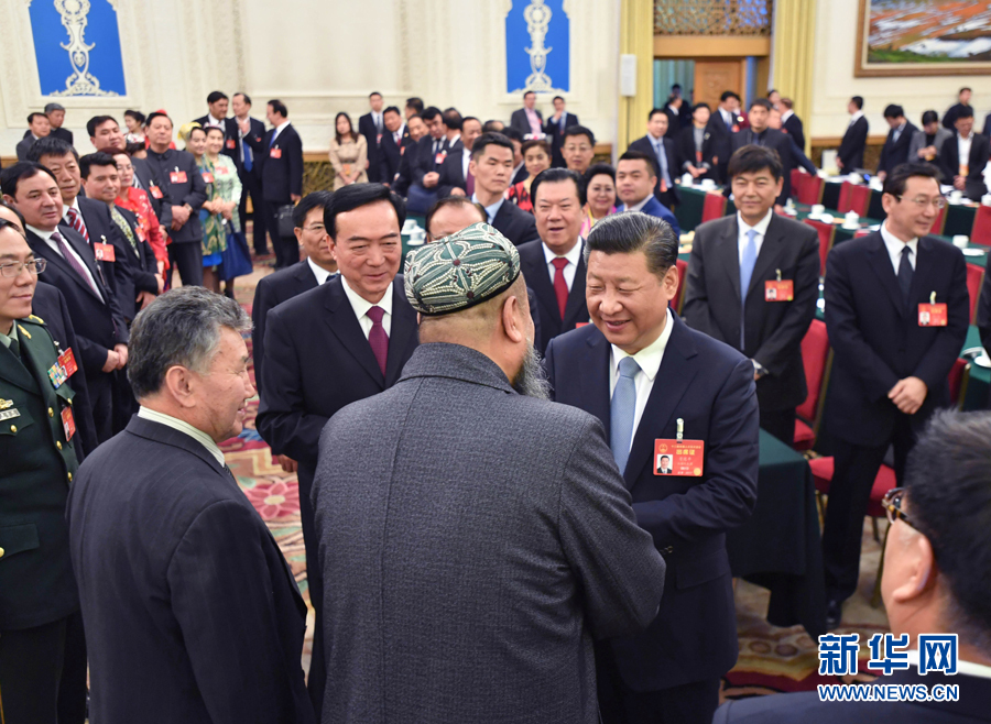 2017年3月10日,习近平在新疆代表团参加审议时说,要全面贯彻党的民族政策,高举各民族大团结旗帜,引导各族群众增强对伟大祖国、中华民族、中华文化、中国共产党、中国特色社会主义的认同,像爱护自己的眼睛一样爱护民族团结,像珍视自己的生命一样珍视民族团结,像石榴籽那样紧紧抱在一起。