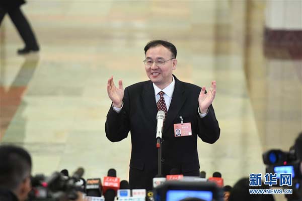 3月15日,第十二届全国人民代表大会第五次会议在北京人民大会堂举行闭幕会。这是国家邮政局局长马军胜接受采访。 新华社记者 陈晔华 摄