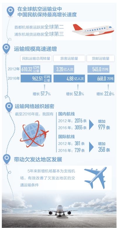 运输网络越织越密,尤其国际航班连年保持两位数增长。截至2016年底,我国各航空公司共开通国内定期航线3055条,比2012年的2076条增长47.2%,定期航班国内通航城市达到214个。国际航线增长更为迅猛,从2012年的381条增至2016年底的739条,增长94%。“一带一路”沿线更成为国际航班开放热点,2016年沿线航班班次量比2012年增加逾100%,目前每周定期航班4551班。