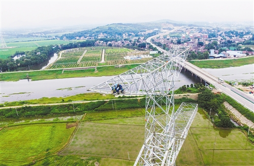 6月21日,技术人员在昌吉—古泉特高压输电工程安徽铜陵钟鸣镇境内的铁塔上进行设备安装作业。当日,“昌吉—古泉±1100千伏特高压直流输电线路工程”安徽铜陵钟鸣段进入瓷瓶安装阶段。昌吉至古泉工程是实施“疆电外送”的第二条特高压输电工程,预计在7月开始架线。工程将推动新疆能源基地的火电、风电、太阳能发电打捆外送,保障华东地区电力可靠供应。陈 晨摄