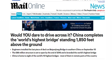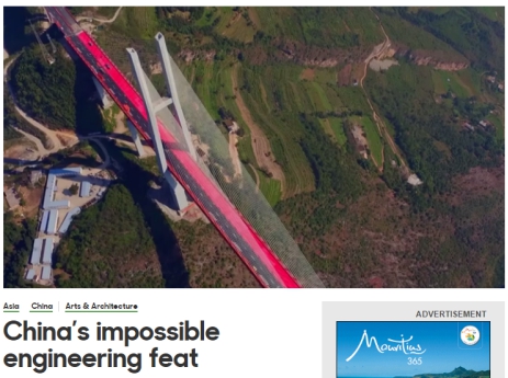 近日,BBC旅游频道发布了一则名为《China's impossible engineering feat(难以想象的中国工程)》的视频,将镜头对准了目前世界上最高的大桥——中国贵州省的北盘江大桥。