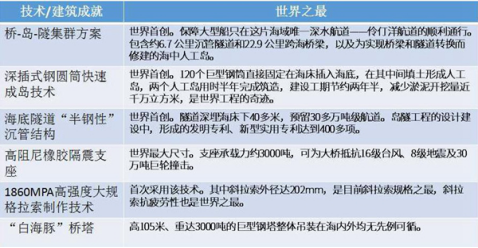 港珠澳大桥横跨伶仃洋,连结粤港澳三地,原来珠海到香港3个半的路,缩短为半小时。港珠澳大桥也是中国建设史上里程最长、投资最多、施工难度最大的跨海桥梁。在建设过程中,港珠澳大桥创下了许多奇迹,请参见下方图表:
