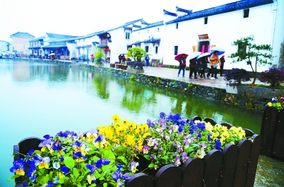 浙江省富阳市龙门古镇东梓关村46幢杭派民居回迁房于2016年8月全部完工,村民只需花费建造成本价便能入住古色古香的新房。图为2017年清明时节,村中油菜花、桃花、梨花竞相绽放,各地游客前来踏春赏景。计海新摄/光明图片