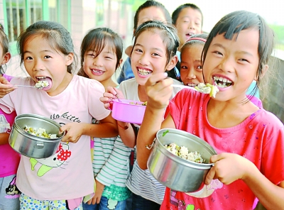 随着国家农村义务教育学生营养改善计划的实施,广西63个县166万名中小学生迎来了免费营养午餐。图为广西罗城仫佬族自治县四把镇新印小学的学生们正在乐享营养午餐。蒙增师摄/光明图片
