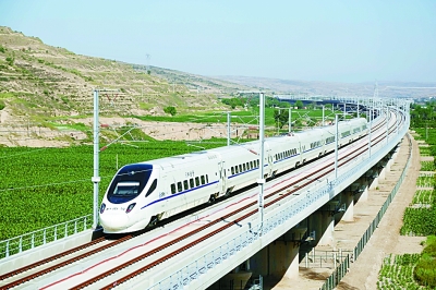 宝鸡至兰州高速铁路日前开通运营,使兰州至宝鸡的旅行时间由7小时缩短至2小时左右,也标志着我国西北地区全面融入全国高速铁路网。图为在宝兰高铁上行驶的列车。王克贤摄/光明图片