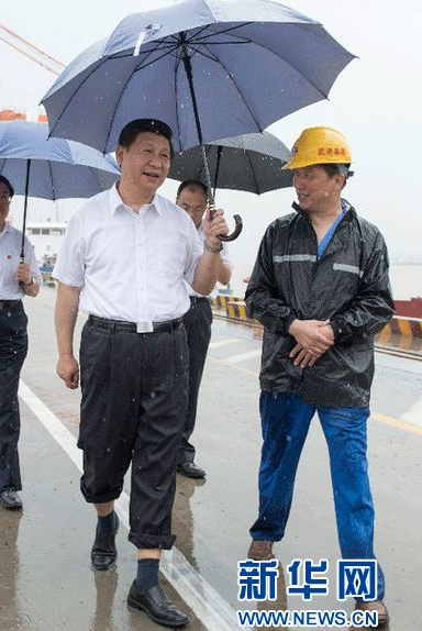 2013年7月21日,习近平冒雨来到武汉新港阳逻集装箱港区考察