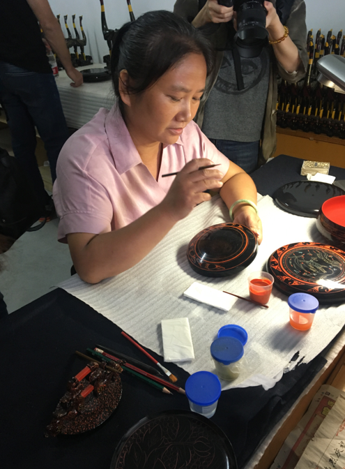 漆器手艺人正在给器具上漆。摄影/庞晟