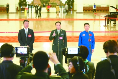 开幕会前,赵宏博、景海鹏、唐嘉陵代表(自左至右)在“党代表通道”接受中外记者集体采访。新华社记者 殷刚摄