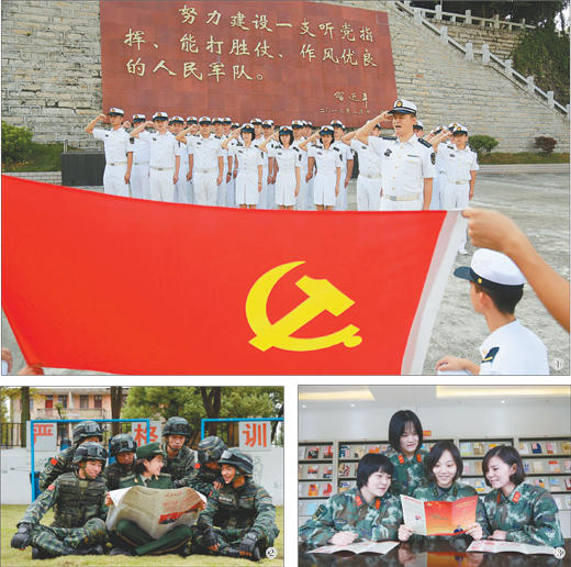 图①:海军东海舰队某护卫舰支队官兵在学习贯彻党的十九大精神活动中,党委机关先学一步、深学一层,用实际行动带动部队学习热潮。图为官兵重温入党誓词。