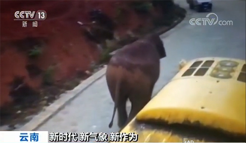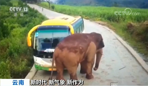12月初,一头亚洲野象突然出现在西双版纳勐海县海往公路上,对一辆抛锚的大客车展开袭击。