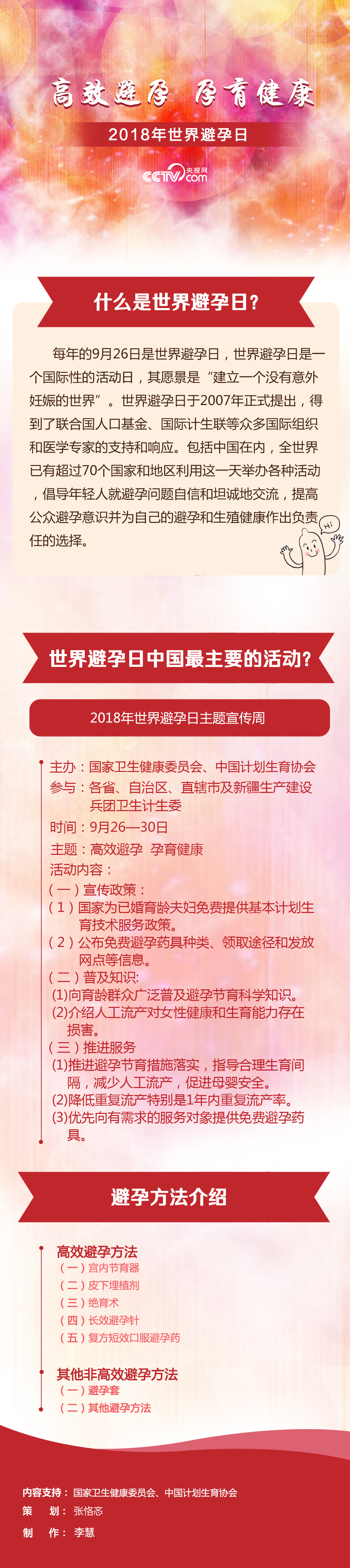 央视网消息:9月26日是世界避孕日,今年的主题是:高效避孕,孕育健康。《“健康中国2030”规划纲要》指出,要立足全人群和全生命周期两个着力点,提供公平可及、系统连续的健康服务,实现更高水平的全民健康。高效避孕,孕育健康生命是主题中应有之义。