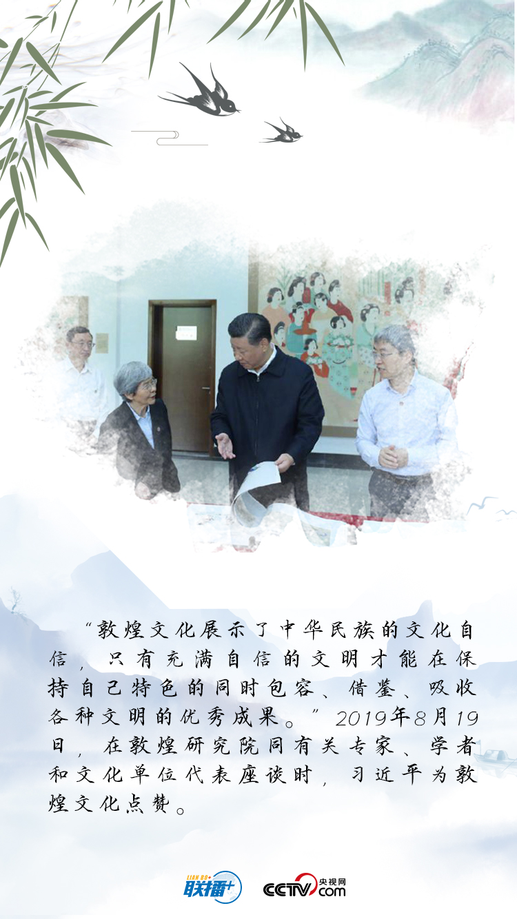 联播+ “敦煌文化展示了中华民族的文化自信……”近日,在敦煌研究院,习近平总书记再一次为敦煌文化点赞。2016年,他在一封致首届丝绸之路(敦煌)国际文化博览会的贺信里写道,“敦煌是历史上东西方文化交汇的重要枢纽,不同文化在这里汇聚和交融,塑造了独具魅力的敦煌文化”。