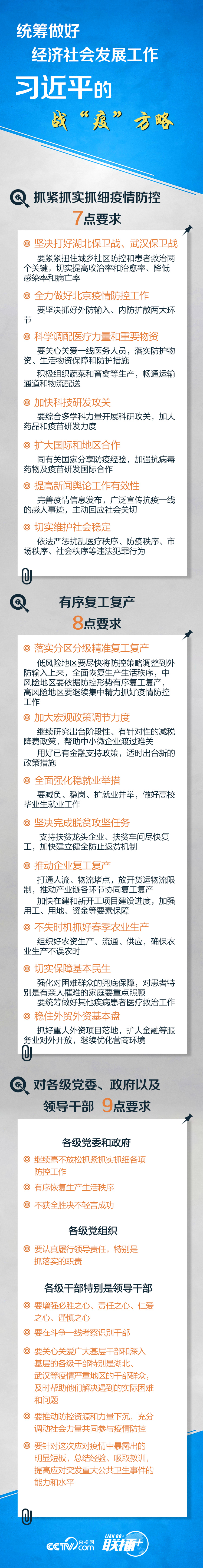 在充分肯定成绩的同时,习近平又对下一步统筹推进新冠肺炎疫情防控和经济社会发展工作作出进一步部署,分别提出疫情防控7点要求、有序复工复产8点要求以及对各级党委、政府及领导干部的9点要求。《联播+》特梳理学习,与您一起在疫情防控最吃劲的关键阶段,变压力为动力,把我国发展的巨大潜力和强大动能充分释放出来,努力打赢疫情防控的人民战争、总体战、阻击战。