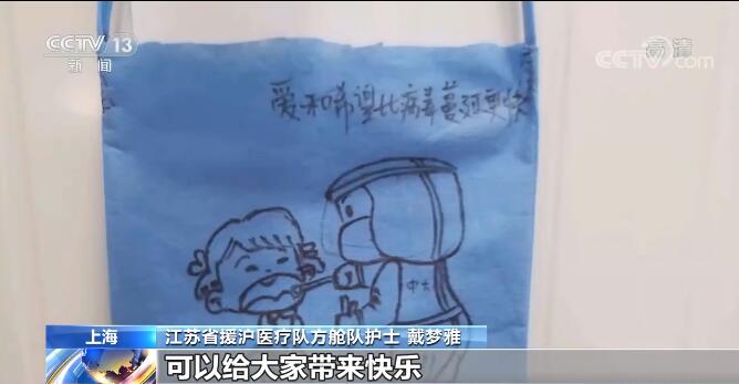 除了有心愿墙,方舱里的“大白”们还和患者们一起开展“套圈游戏”等趣味活动来帮助大家缓解放松心情。“95后”护士戴梦雅和同事在舱内工作时,发现“大白”防护服没有口袋很不方便,她便就地取材自制了这种别具一格的小包,擅长画画的她还在上面绘制了各种可爱的漫画造型。