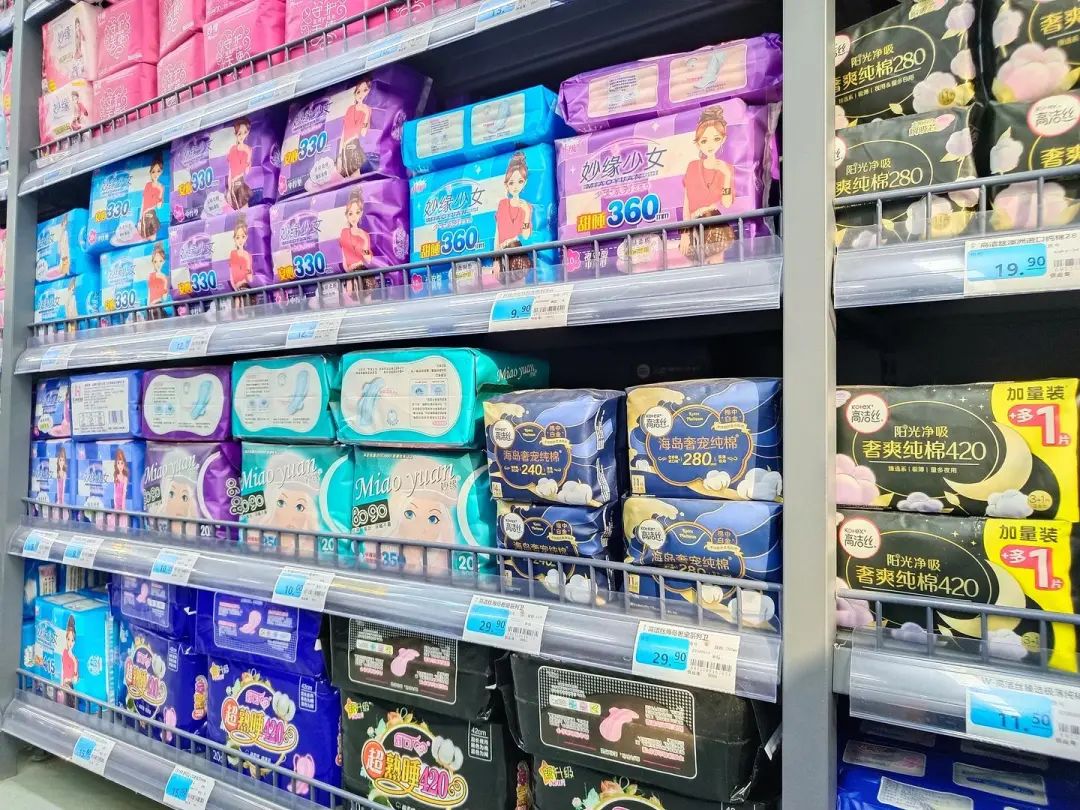 ▲2024年11月22日,江苏宿迁,市区一家超市货架上的卫生巾 图据视觉中国