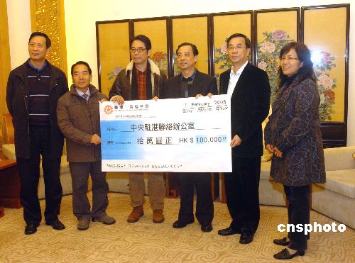 二月一日,香港工会联合会(工联会)理事长黄国建(左三)、副会长梁富华(左二)前往中央人民政府驻香港特别行政区联络办公室(中联办),递交港币十万元支票,救济内地雪灾受灾省区。中新社发 邓庆乐 摄