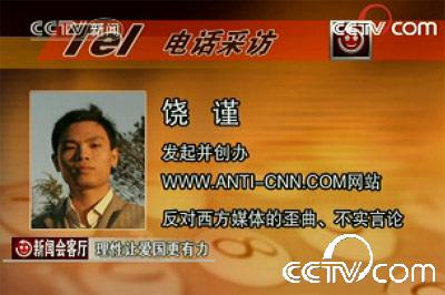 在这次的爱国热情传递当中,人人都看到了网络的力量,当西方一些媒体对中国有不实的报道的时候,饶瑾发起并创办了ANTI-CNN网站,揭露西方媒体不实报道,为网民营造了一个创造求真务实、理性交流的空间。“面对伤害,我们应该更加冷静、坚强,独立思考,判断是非,守法文明,我们不赞同一切冲动和不文明的方式,我们应该还是展示中国人的大国民素质,就是理性、坚定,真诚热情开放。”