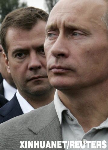 据俄媒体报道,统一俄罗斯党、公正俄罗斯党、俄罗斯农业党和公民力量党4党联合提名第一副总理梅德韦杰夫为下届总统候选人。普京2007年12月10日在会见4党领导人时对这一建议表示"完全赞同"。这是2007年9月13日普京(前)和梅德韦杰夫参观俄罗斯中部一处建筑工地的资料照片。 新华社/路透