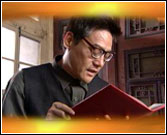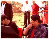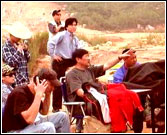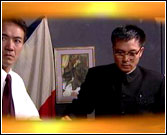 金韬:谢圆按照原来剧本里的陈天一这个人物的设定,应该是一个思想者,是一个谋士。这种题材的片子从整体上是很严肃的,因为它是个正剧,所以如何在里边一些个别人物上产生其它的效果,就是让他的性格凸现出另外的很鲜活的一面,我觉得有赖于演员的确定,这样我们就把人物定位在谢圆演的这个人物上。谢圆很投入,第一次我跟他谈话,把剧本给他,他觉得特别感兴趣,说没有人让我演这种角色,我自己不一定有很大的信心。第二次来,他就坐在那儿眼泪汪汪的,我也不知道为什么,怎么劝都不成,后来等过了半个小时以后,我觉得我得做做他思想工作的时候,他突然告诉我,他说导演,我在给你信心,也给我自己信心,我想告诉你,我除了很活跃、很幽默的一面,有时候我能沉下来。我说对,你演的这个角色就是要沉下来,但是不要把你自己表演的本色的东西丧失的太多,否则我就不会找你。(孙小梅:说明您在选演员方面考虑非常独到。)还有就是你提到的魏子和谢圆的眼镜,如果我没记错的话,谢圆的眼镜应该是五百的近视,魏子的是六百。我就特别希望人戴上眼镜以后,让观众能够感受到他的脸的局部是变形的,眼睛跟平时不一样了,而且同时他真戴上一个近视镜以后,他自己的感觉都不一样。由于魏子一点都不近视,他就太不一样了,以至于我们最后不得不找两副眼镜,在全景里边给他戴一副正常眼镜,一到拍近景和特写的时候一定要换上这副眼镜。所以有一场戏,他跟他女儿头一次拍,他跟他女儿说话的时候,他找不着距离,他不知道这个女演员离他有多远,最后女演员都乐了,说你再往前探就碰着我鼻子了。