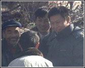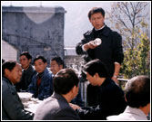 胡亚捷:是同期声的问题。我们在太行山下拍戏非常静,但是那个地方的鸡不光早上打鸣,白天也打鸣,所以正在拍着白天戏的时候,鸡一打鸣这感觉就不对了。而且一只鸡叫,全村的鸡全叫。没办法,制片部门就专门雇了几个人在拍戏的时候分散到各家各户去,只要一只鸡叫,就开始拿棍子,然后它就不叫了,即使是这样,你也不知道哪家的鸡又叫起来了,所以这样就会影响进度。后来扮演田茂林的演员周小斌想了一个主意,与其费那么大的功夫,花着钱雇人,不如把鸡买来吃了。