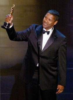 丹泽尔-华盛顿演技精湛,仪表堂堂、风度翩翩,深受女性影迷的喜爱。这个接受过舞台专业训练的黑人影星以前一直在电视剧中发展,80年代后转入电影业,90年代终被好莱坞所接纳,跨入A级演员的行列。是好莱坞最具号召力的演员之一,也是目前好莱坞身价最高的黑人影星。他曾于1988年获第60届奥斯卡奖最佳男配角提名,1990年获第62届奥斯卡最佳男配角奖,1993年和2000年分别获第65届、第72届奥斯卡奖最佳男主角提名,2002年获第74届奥斯卡奖最佳男主角提名,一共获得了5次奥斯卡奖提名----2次最佳男配角、3次最佳男演员的提名,并赢得了1次最佳男配角奖。曾有人评论他是“继薛尼-鲍迪之后好莱坞最具希望的黑人男明星 ”。(图为丹泽尔-华盛顿在台上领奖)
