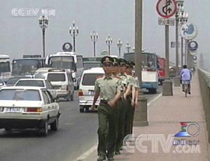 武警江苏总队南京长江大桥执勤战士李蒋:“南京这段时间天气热,大桥上气温很高,非常容易造成行人中暑、车辆抛锚、爆胎等事故。我们每天在大桥上巡逻,一旦发现这些情况就及时处理,保障大桥的安全畅通。”