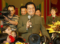胡锦涛说,很高兴同大家一起欢庆“六一”国际儿童节。刚才,小红星幼儿艺术团小演员们的演出很精彩、很感人,充分反映了广大儿童活泼可爱、健康向上的精神风貌。祝小朋友们节日愉快,天天向上,健康成长。
