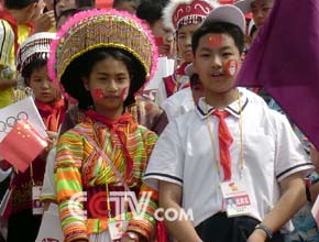 面带奥运与国旗标志的少先队员 |