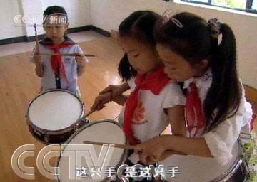 这是蔷薇小学和红梅小学的少先队员联合组成的鼓乐队在进行排练。正在辅导同学这个孩子,叫赵雪,她是红梅小学四年级的学生,去年她加入了学校的鼓号队,很快成为了主力队员,因为表现出色,现在她还当上了队里的小辅导老师。