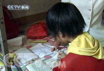 郭宁宁一家人1994年从家乡河南驻马店来到北京,儿子刘虎在北京市海淀区一家公办的小学一年级上学,由于年纪小,他并不清楚自己要交哪些费用,只知道自己每个学期要比北京本地的同学多交一些。在房间里一个不引人注意的角落,刘虎的姐姐,一直躲在那里默默地写着东西。刘虎说,因为家里拿不出多余的钱,比自己大三岁的姐姐,已经在一个学期前辍学回家。