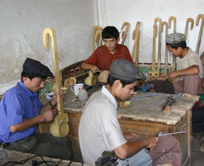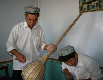 随后,我们走访了吾库萨克乡开办的中学职业教育乐器制作实习基地,该基地设有乐器制作、雕刻、油漆、木工、地毯编织、裁缝6个专业,由5名师范学校毕业的教师、7名技艺精湛的艺人和9名木匠共21人组成实习基地指导教师队伍,因地制宜,采取基础教育和手工艺教学相结合的办学方式,使学生在获得文化知识的同时,掌握精湛的乐器制作技艺,目前已经有650名学生在这里接受了系统的培训,让他们有了谋生的手段。