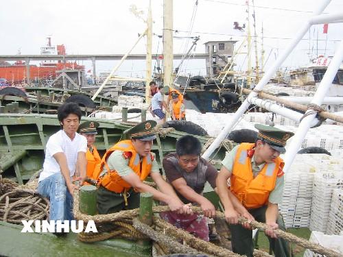 | 8月4日上午,浙江台州公安边防支队官兵帮助渔民为进港避台风的渔船带好缆绳。 据当地气象部门预测,今年第9号台风“麦莎”可能在浙江登陆,浙江沿海的船舶纷纷开进港口避风。为了确保渔船有序进港,浙江省台州市公安边防支队船艇大队派出船艇6艘、官兵135人协助当地渔民备战“麦莎”。 新华社发 |