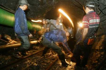 | 8日凌晨,发生事故的矿井下,救援人员正在安装抽水机。图片来源:中青在线 |